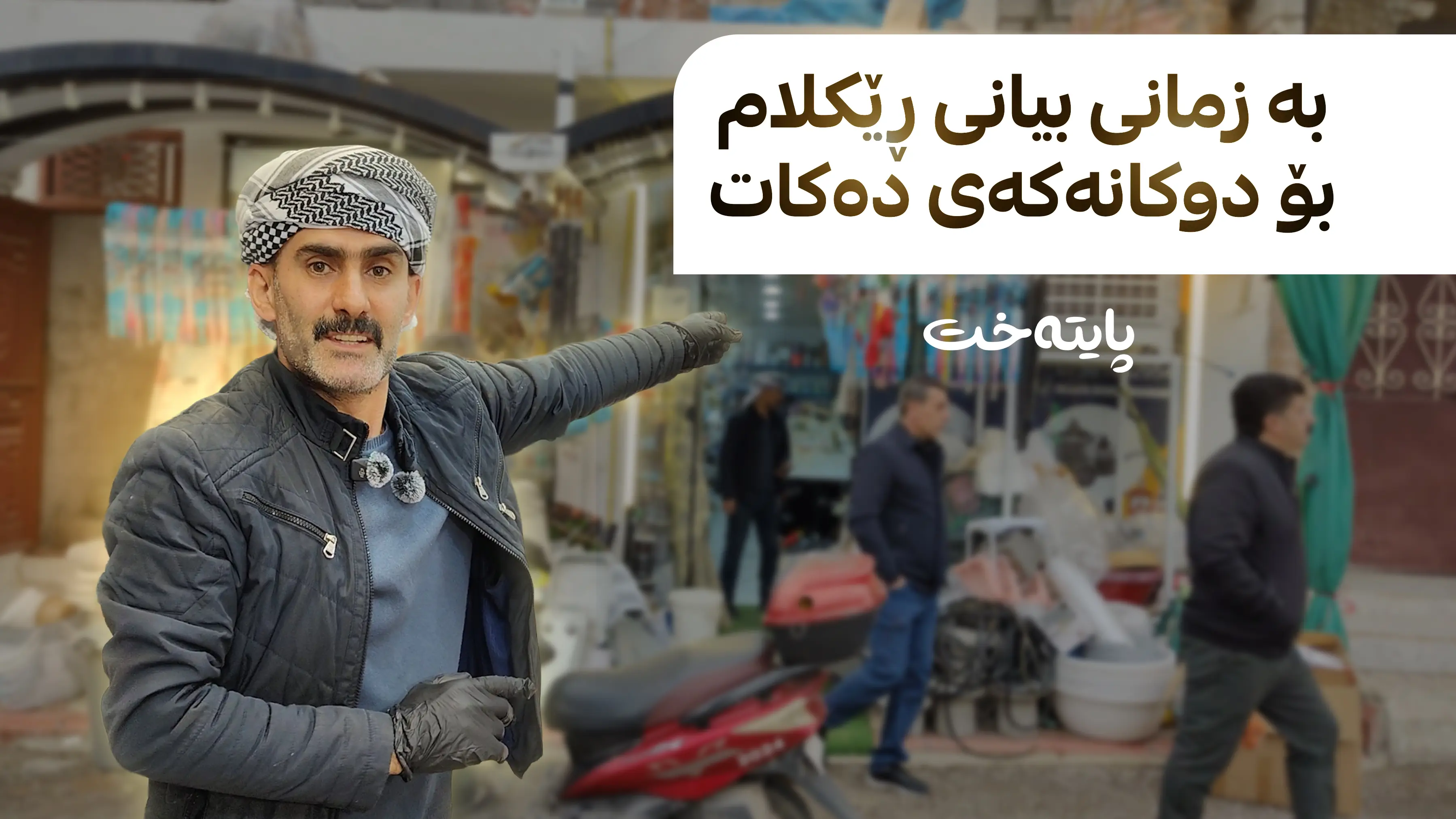 بە زمانی بیانی ڕێکڵام بۆ دوکانەکەی دەکات