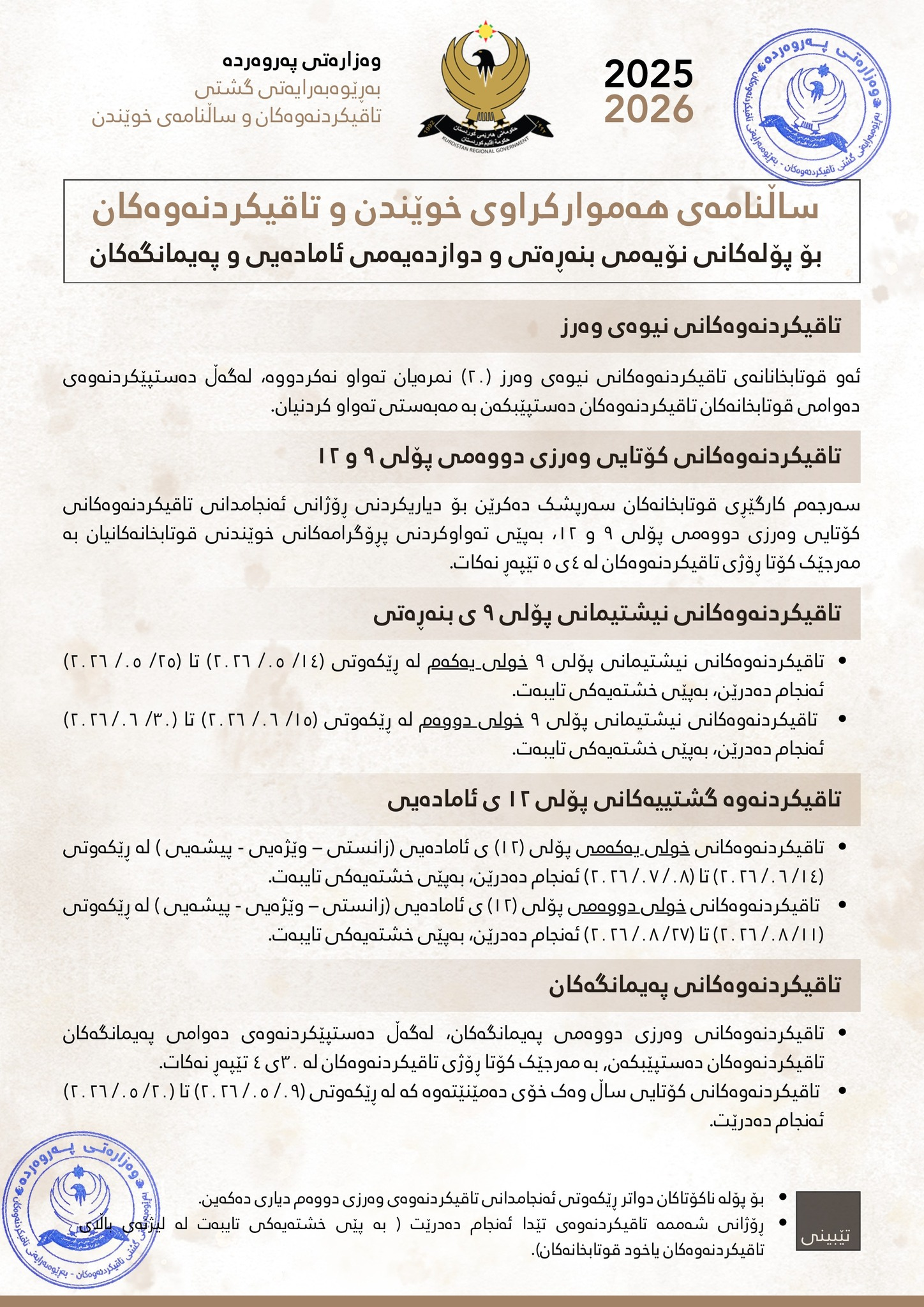 ئهمڕۆ وهزارهتی پهروهردهی حكومهتی ههرێمی كوردستان بڵاویكردهوه، تاقیکردنەوە نیشتمانییەکانی پۆلی 9ی بنەڕەتی خولی یەکەم لە 14ی ئایاری 2026 تا 25ی ئایاری 2026 بهڕیوهدهچێت، ههروهها خولی دووەم: لە 15ی حوزەیرانی 2026 تا 30ی حوزەیرانی 2026 بهڕیوهدهچێت.