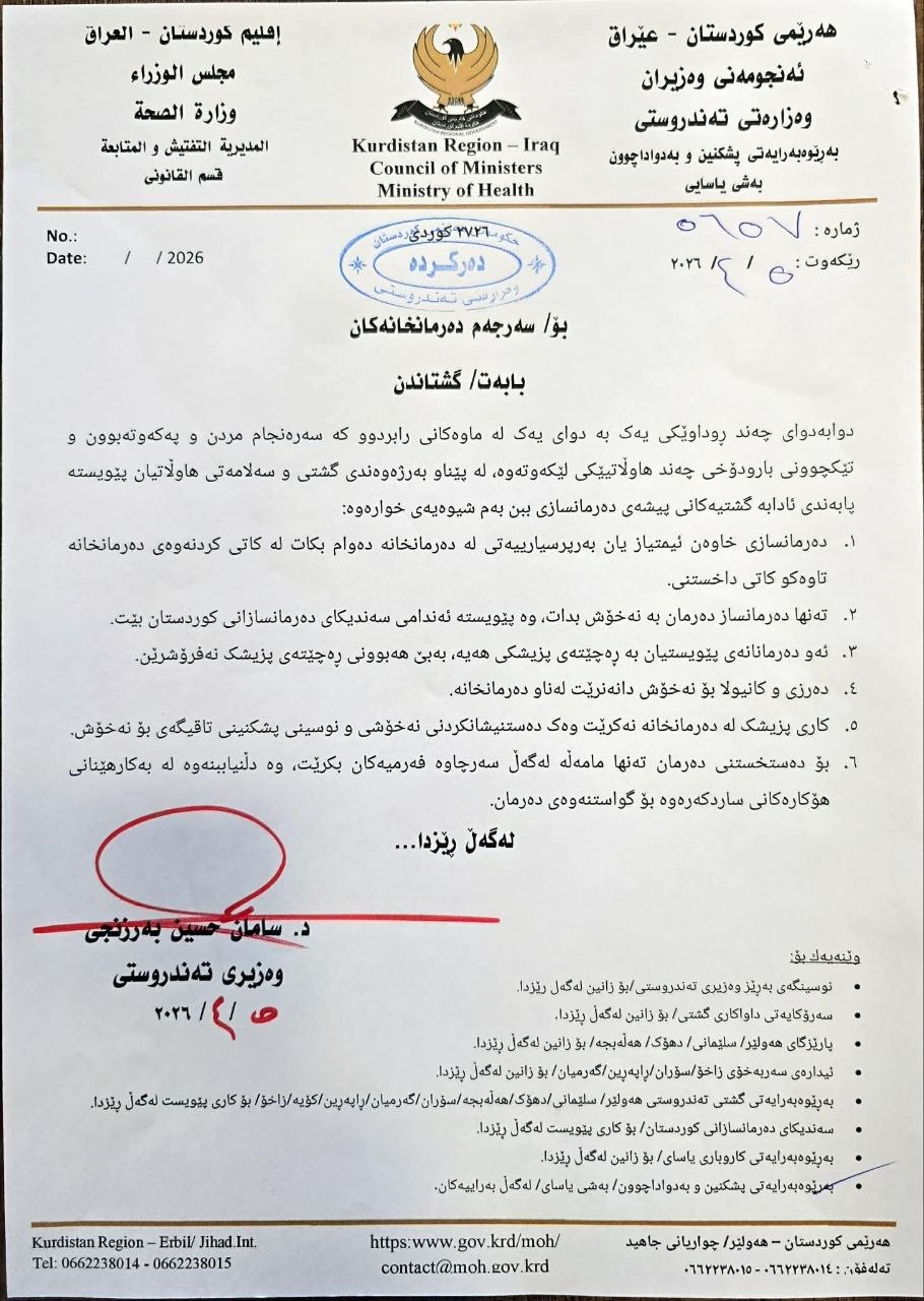 گشتاندنهكهی وەزارەتی تەندروستی ئیمزای د. سامان بەرزنجی، وەزیری تەندروستی لەسەرە و ئاماژەی بەوە کردووە، بەهۆی چەند ڕووداوێکی نەخوازراو کە بوونەتە هۆی گیانلەدەستدان و تێکچوونی باری تەندروستیی هاوڵاتیان، بڕیاریانداوە بە توندکردنەوەی ڕێکارەکان لە دەرمانخانەکاندا.